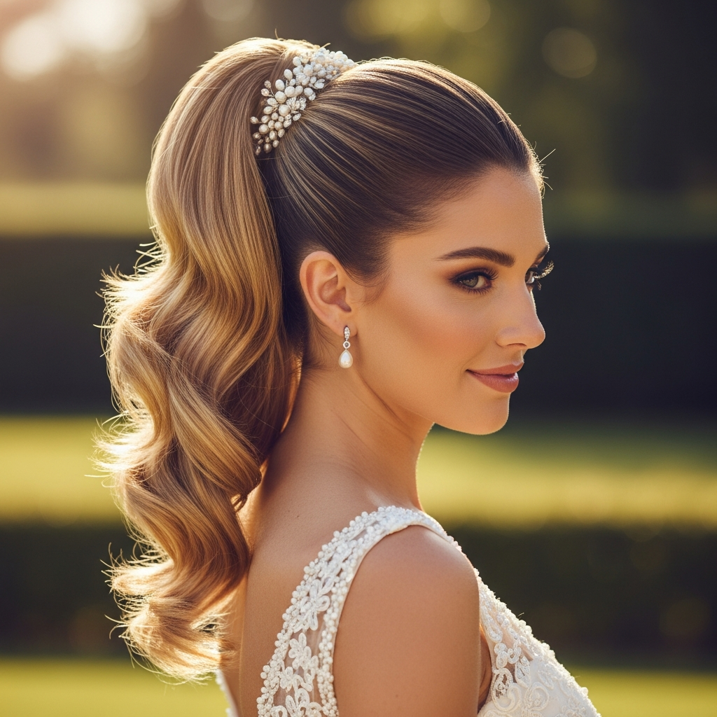For the modern, sophisticated bride, a sleek high ponytail offers a chic and powerful look. This style is polished, confident, and beautifully highlights the décolletage and back of the dress. It’s unexpectedly elegant for a wedding day.