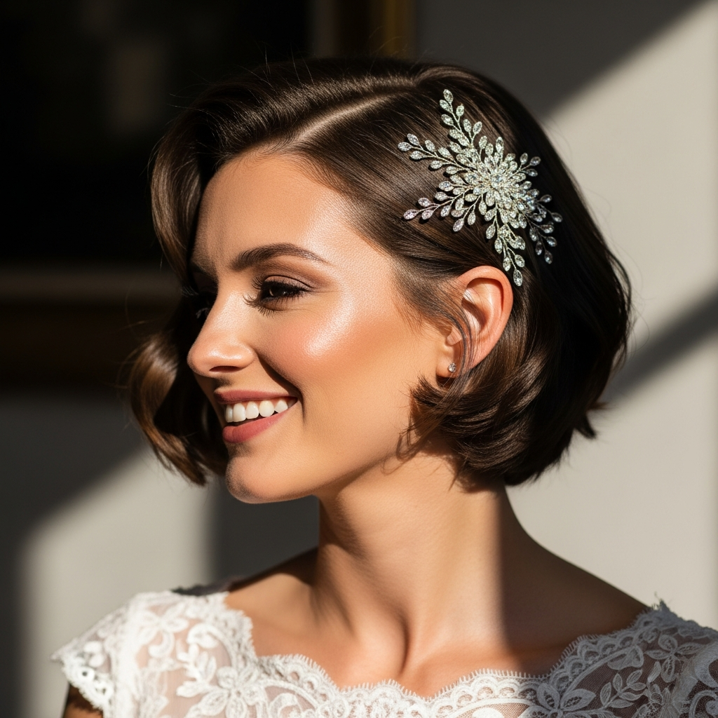 Who says short hair can’t be bridal? Short hair offers unique opportunities for elegance and sophistication on your wedding day. By embracing your cut and adding the right embellishments, you can create a truly stunning and memorable look that highlights your features beautifully. It’s a bold and confident choice.