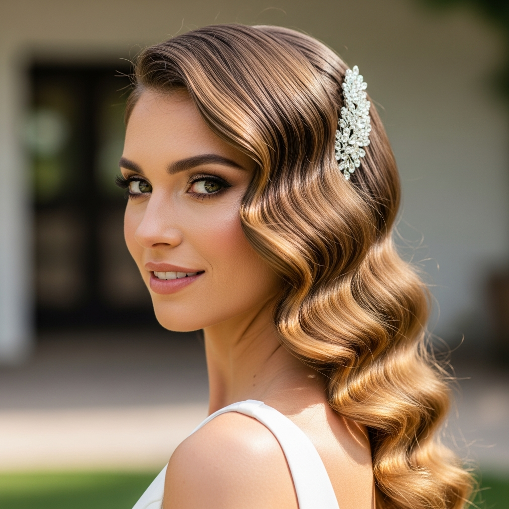 Transport yourself to the golden age of Hollywood with glamorous vintage waves. This iconic style, also known as ‘Hollywood waves,’ offers unparalleled sophistication and a touch of old-world allure. It’s the ultimate choice for a luxurious, red-carpet worthy wedding.