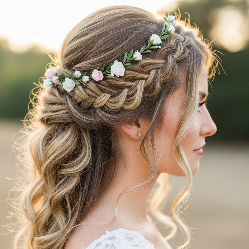 - Autumn Rustic Weddings: Textured braids, loose waves, and styles that can incorporate earthy elements like dried flowers or delicate leaves are fitting. A braided crown or a romantic loose updo complements this theme beautifully.
