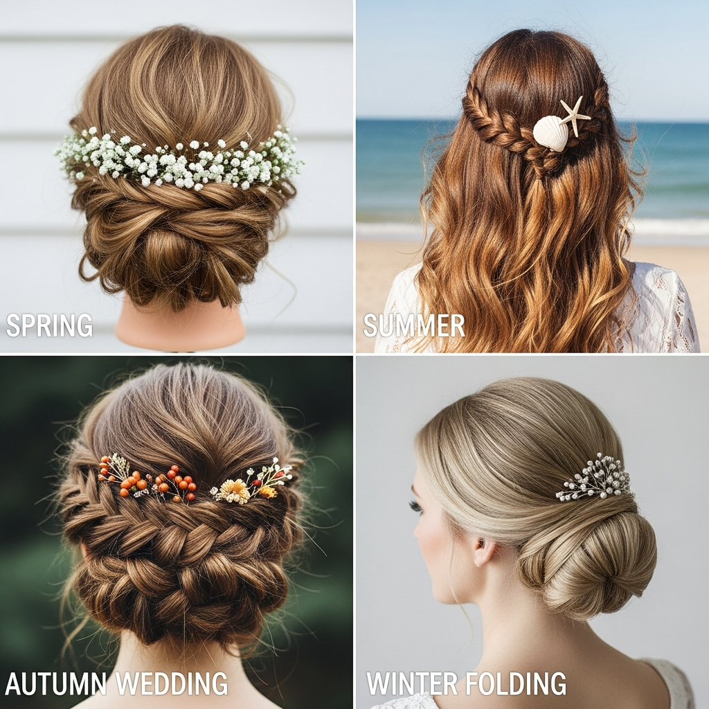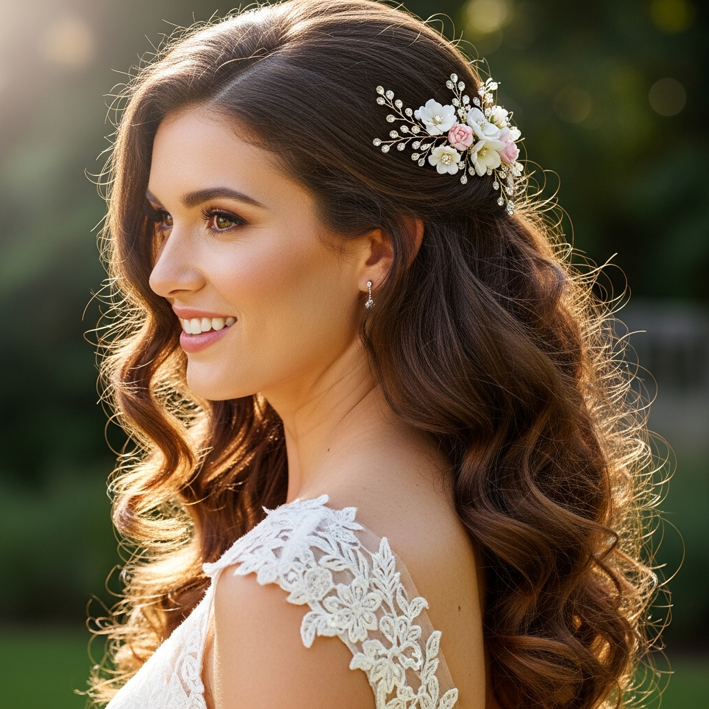 - Spring Garden Weddings: Soft, romantic styles adorned with fresh flowers are perfect. Half-up styles or loose updos that embrace a gentle breeze are lovely choices. Think fresh florals or delicate hair vines.