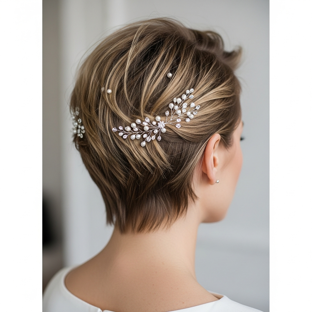 Focus on enhancing your cut. For pixies, use texturizing paste to create definition or sweep bangs dramatically. For bobs/lobs, add soft waves with a flat iron or small curling iron for movement. The key is to then add a beautiful hair accessory like a jeweled clip, headband, or birdcage veil.
