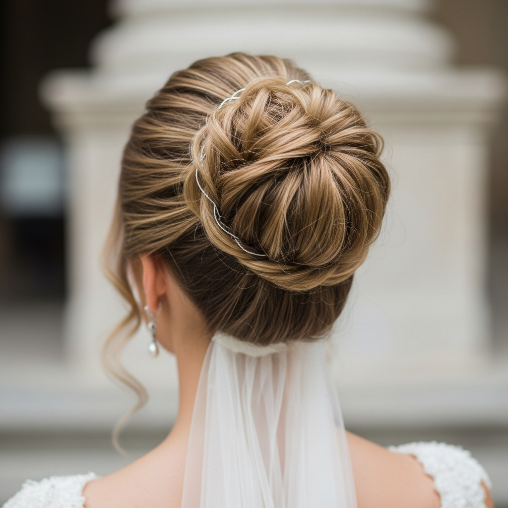 The “messy” bridal bun is anything but unkempt; it’s artfully undone, with carefully placed loose strands and a soft, textured finish. This style embodies modern romance and a relaxed elegance, perfect for a bride who wants to look beautiful without feeling too “done.”