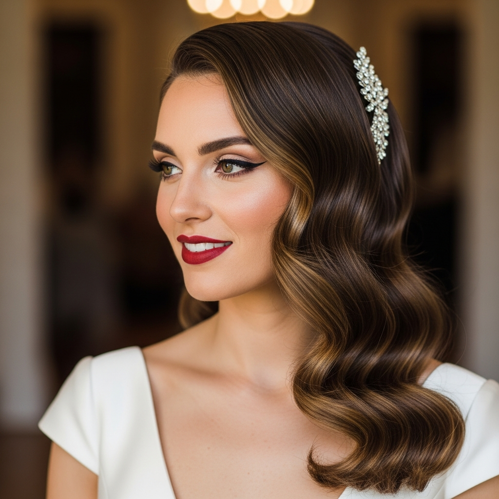 Channeling the elegance of old Hollywood, vintage waves are sleek, glossy, and perfectly sculpted. This glamorous style makes a strong statement, exuding sophistication and a touch of drama, ideal for a formal or classic wedding.
