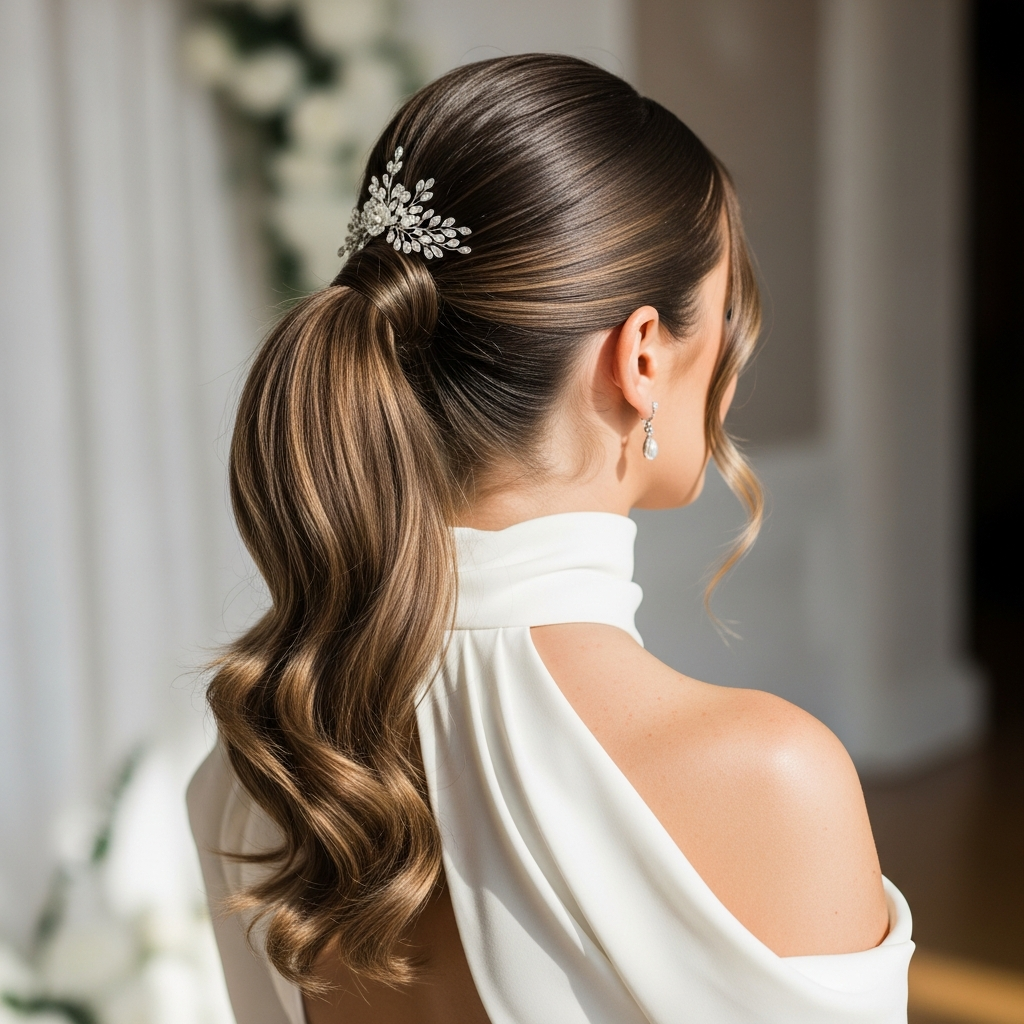 The modern ponytail elevates a casual style into a sophisticated bridal statement. It can be high and sleek, low and elegant, or textured and voluminous, often adorned with pearls, ribbons, or delicate pins. This trend is fresh, chic, and practical.