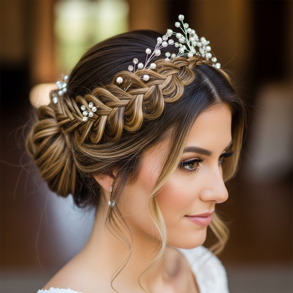 A crown braid wraps around the head like a beautiful halo, evoking a whimsical, fairy tale charm. It’s a romantic and ethereal choice, perfect for brides who want to feel like royalty on their special day, often adorned with tiny flowers or delicate gems.