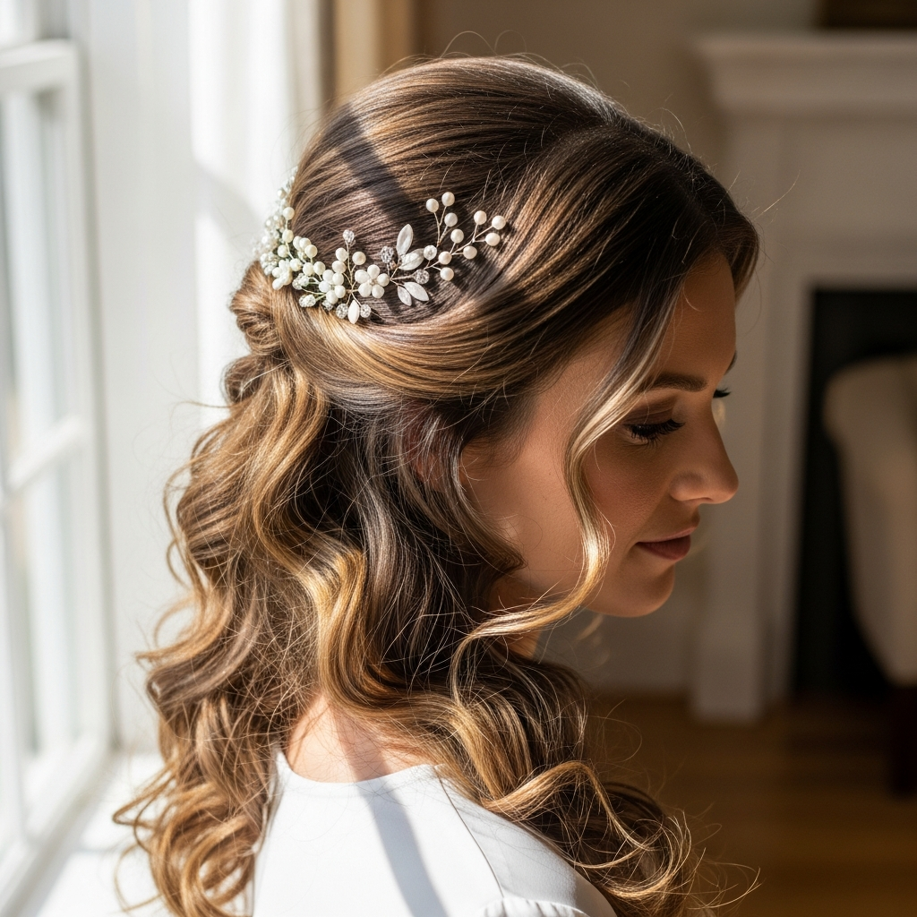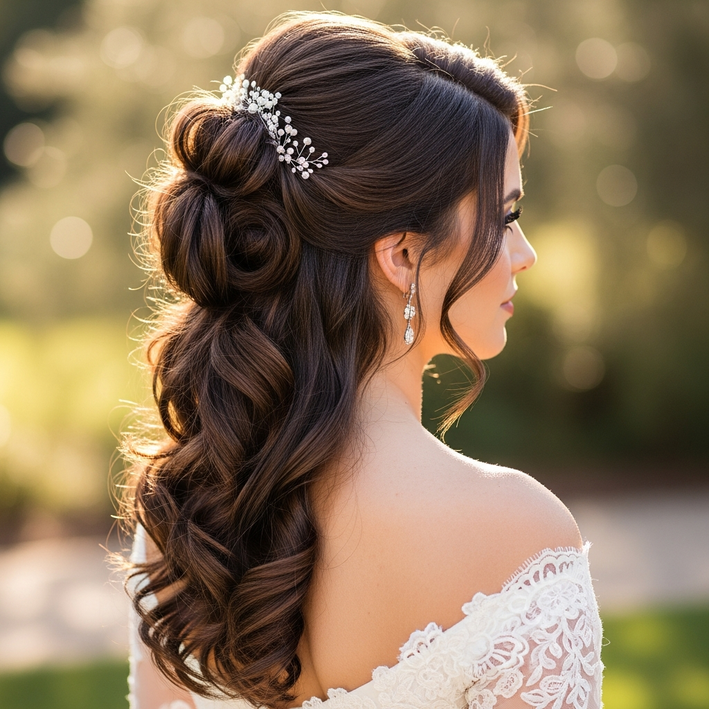 The half-up, half-down style is incredibly versatile, offering the best of both worlds: hair kept off the face while allowing lush length to cascade down. Modern brides love adding volume at the crown for a touch of glamour and height.