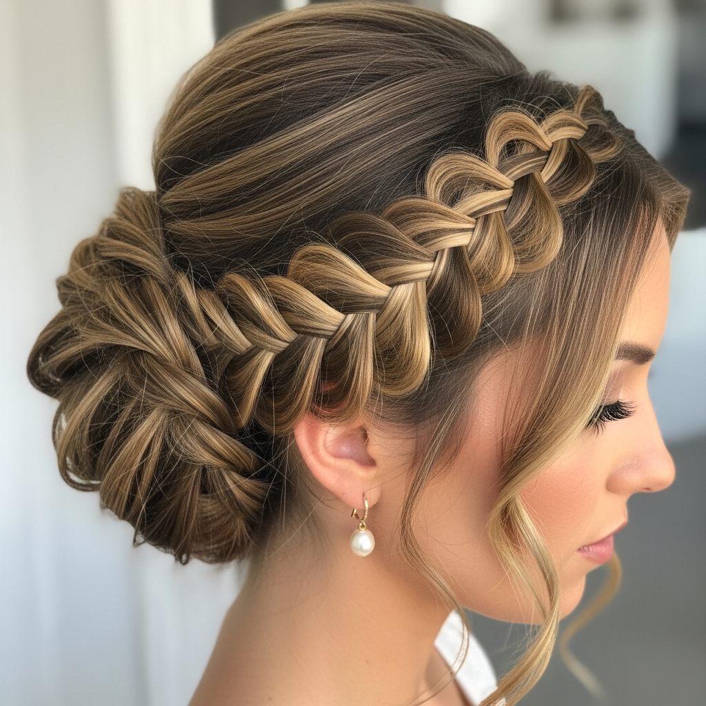 A braided updo is versatile and suits most face shapes. Loose tendrils around the face can soften the look for square or heart-shaped faces.