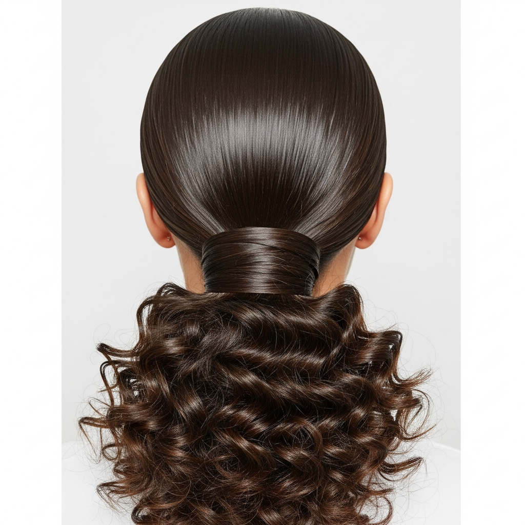 A low ponytail secured at the nape of the neck provides a refined and modern silhouette. To elevate this look and increase shine, wrap a small section of hair or a silk ribbon around the elastic base. This adds tension to the roots, keeping them flat and shiny, while the length of the ponytail is treated with a leave-in conditioner to prevent expanding. It is a go-to style for a clean, professional appearance.