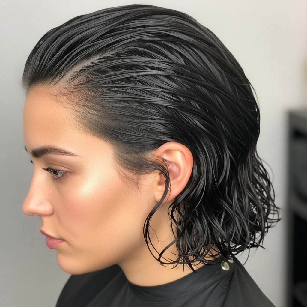 The wet-look style is a high-fashion choice that completely eliminates frizz by sealing the hair with a mixture of gel and oil. Slicking a curly bob back away from the face creates a bold and modern aesthetic. Because the hair is saturated with styling products, the cuticle remains closed and reflective, offering the ultimate level of shine. It is a durable style that remains unchanged regardless of the humidity levels.
