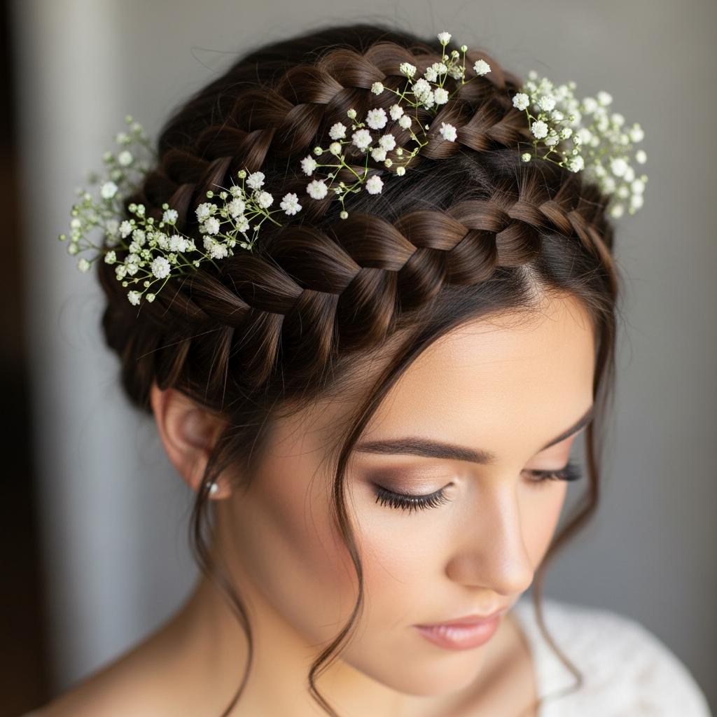The braided crown, or milkmaid braid, is a whimsical yet structured updo perfect for outdoor weddings or bohemian-themed events. Two braids are wrapped around the top of the head to create a crown effect. This style is practical for long events as it keeps the hair securely in place throughout the festivities.