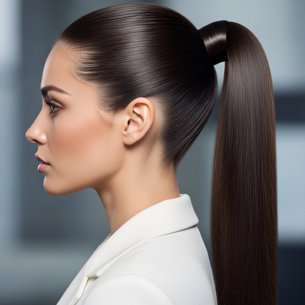 A sleek high ponytail exudes confidence and modern glamour. By pulling the hair tightly back and securing it at the crown, this look highlights facial features and elongates the neck. Wrapping a small section of hair around the elastic adds a professional finish that elevates the style from casual to party-ready.