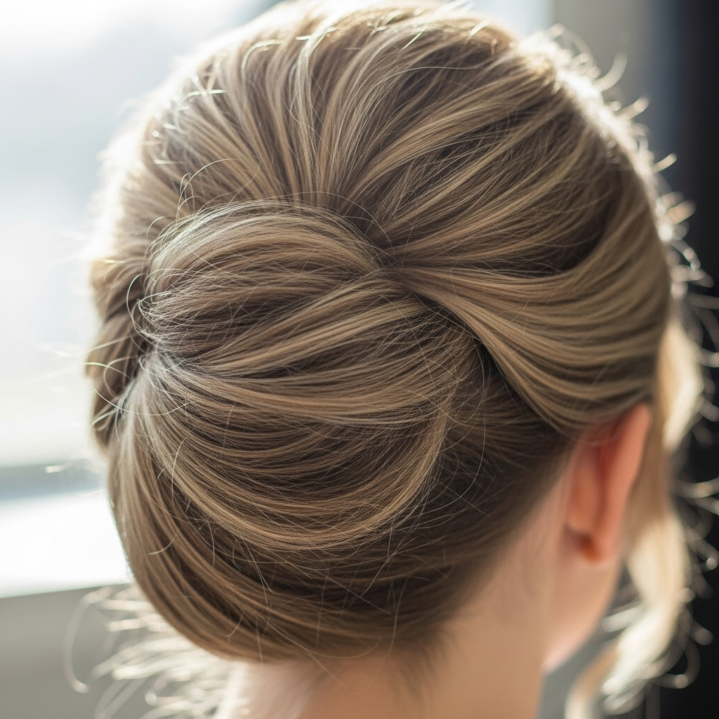 The French twist is a vertical roll of hair that creates a sophisticated and elongated look. The textured version allows for a bit more volume at the crown and a slightly less rigid finish, making it suitable for both cocktail parties and formal weddings. It is a quintessential choice for the mother of the bride.