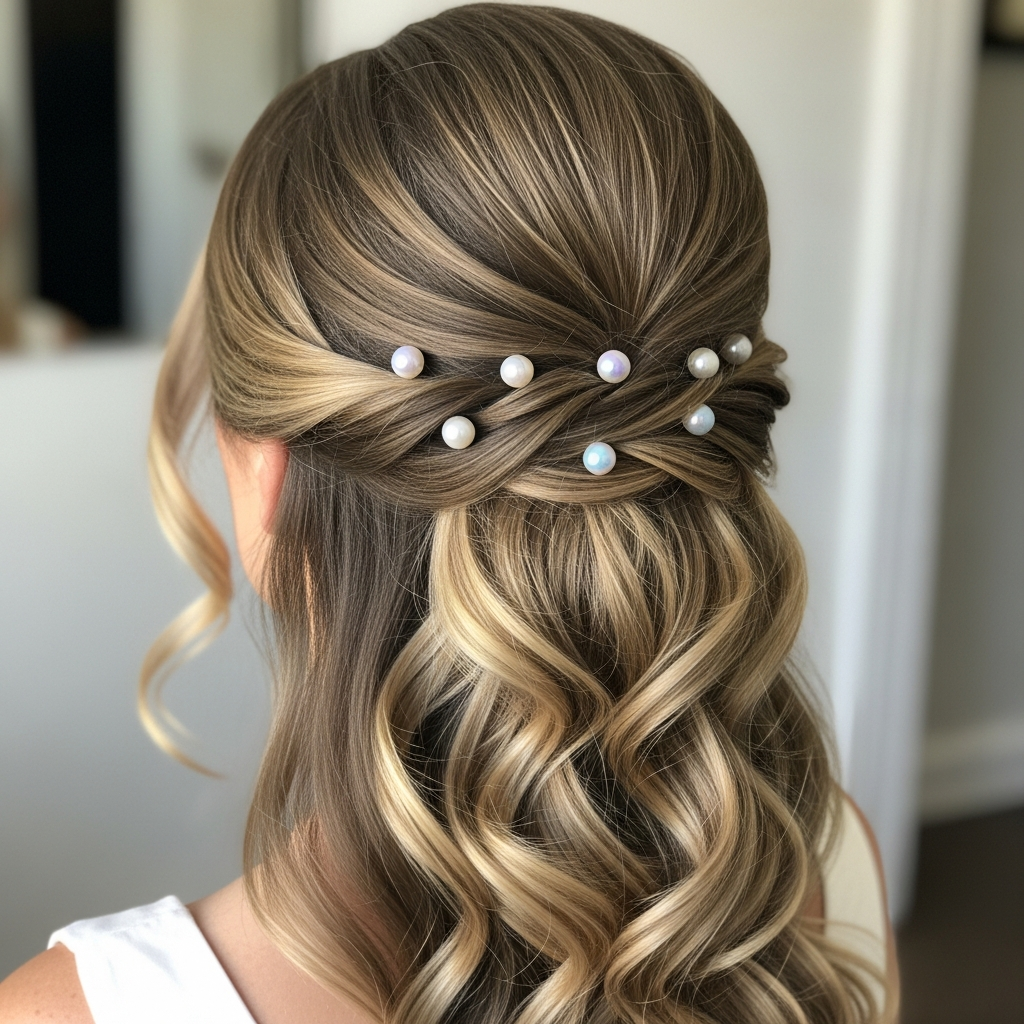 The half-up half-down style offers the best of both worlds, providing the volume of open hair with the convenience of an updo. Incorporating pearl pins into the upper section adds a touch of bridal luxury. It is a favored choice for bridesmaids as it suits various hair lengths and textures.