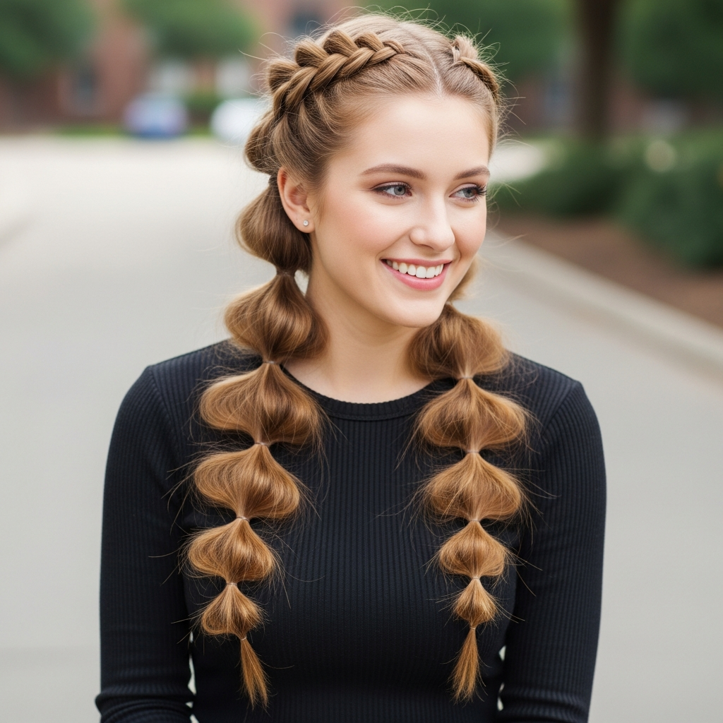 Styling method: Part your hair down the middle. Create two pigtails and braid each one. Wrap one braid over the top of your head like a headband and pin it securely. Repeat with the second braid, overlapping slightly, and pin. Tuck in any loose ends.