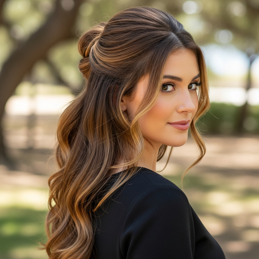 Styling method: Take a section of hair from above each ear. Twist each section gently towards the back of your head. Bring the two twisted sections together at the back, securing them with a small elastic or bobby pins. Optionally, create loose curls in the remaining hair.