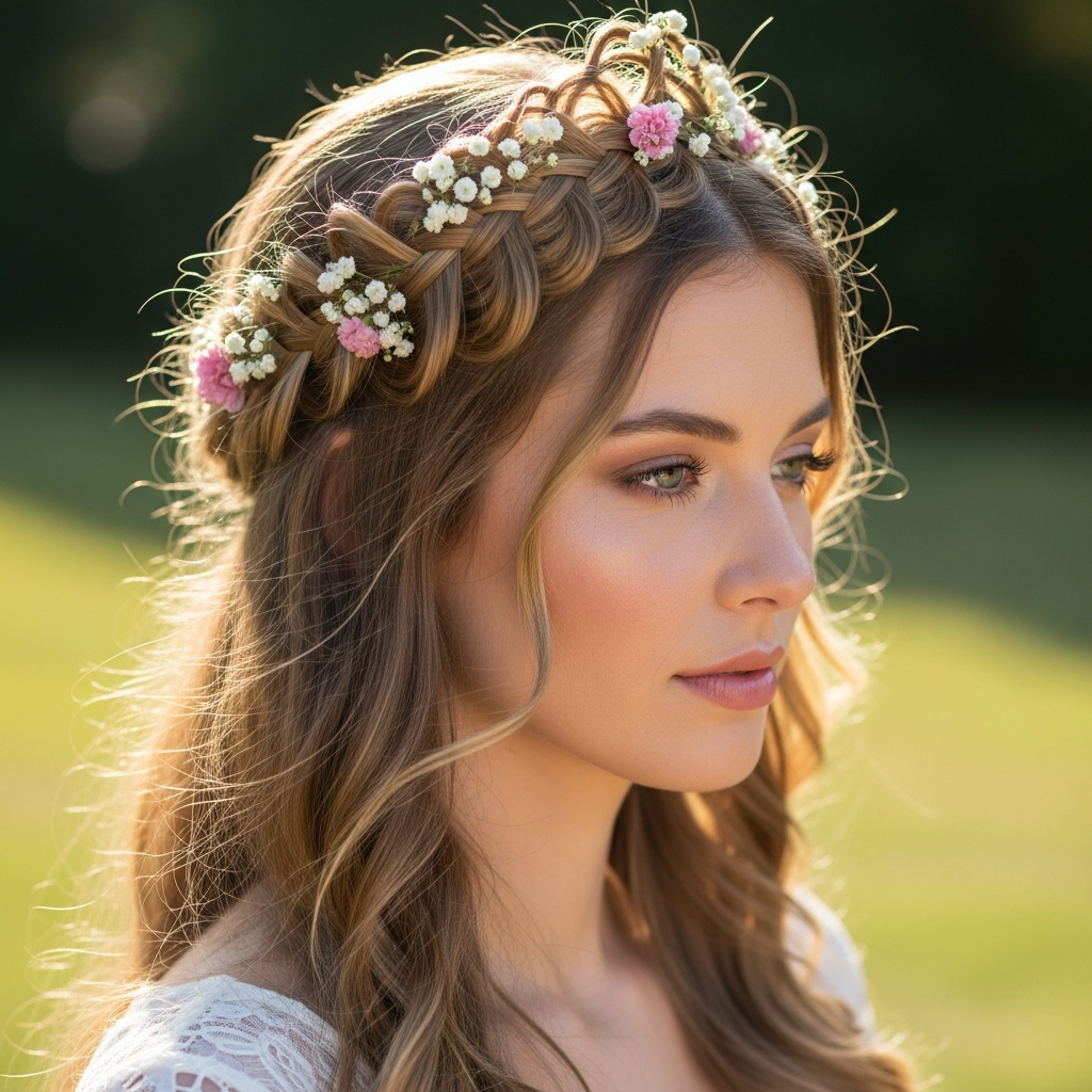 A braided crown, often called a milkmaid braid, is a sophisticated and romantic style that keeps hair neatly in place while looking utterly enchanting. It’s perfect for both casual events and formal occasions.
