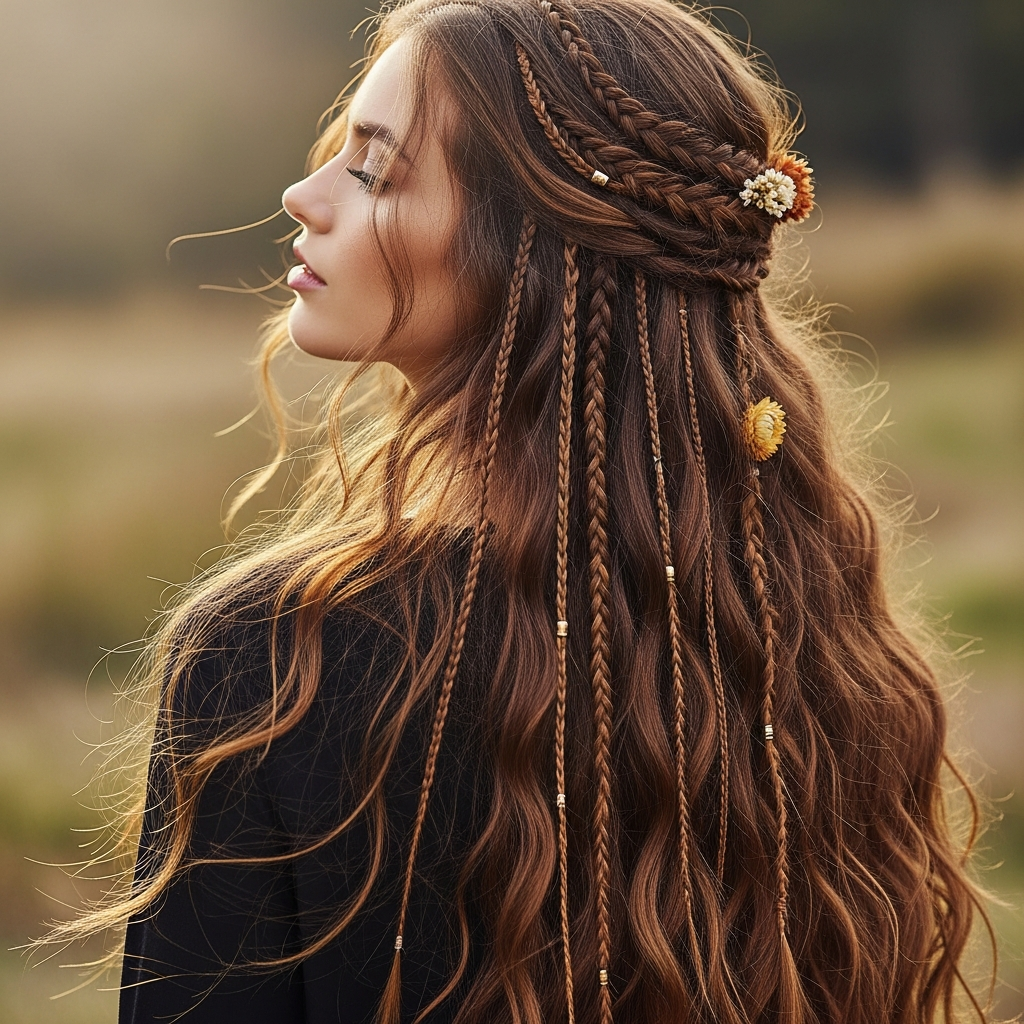 Bohemian braids involve incorporating multiple small, delicate braids into your loose, flowing hair. This style creates a whimsical, free-spirited look perfect for festivals, beach days, or just adding a touch of romance to your everyday.