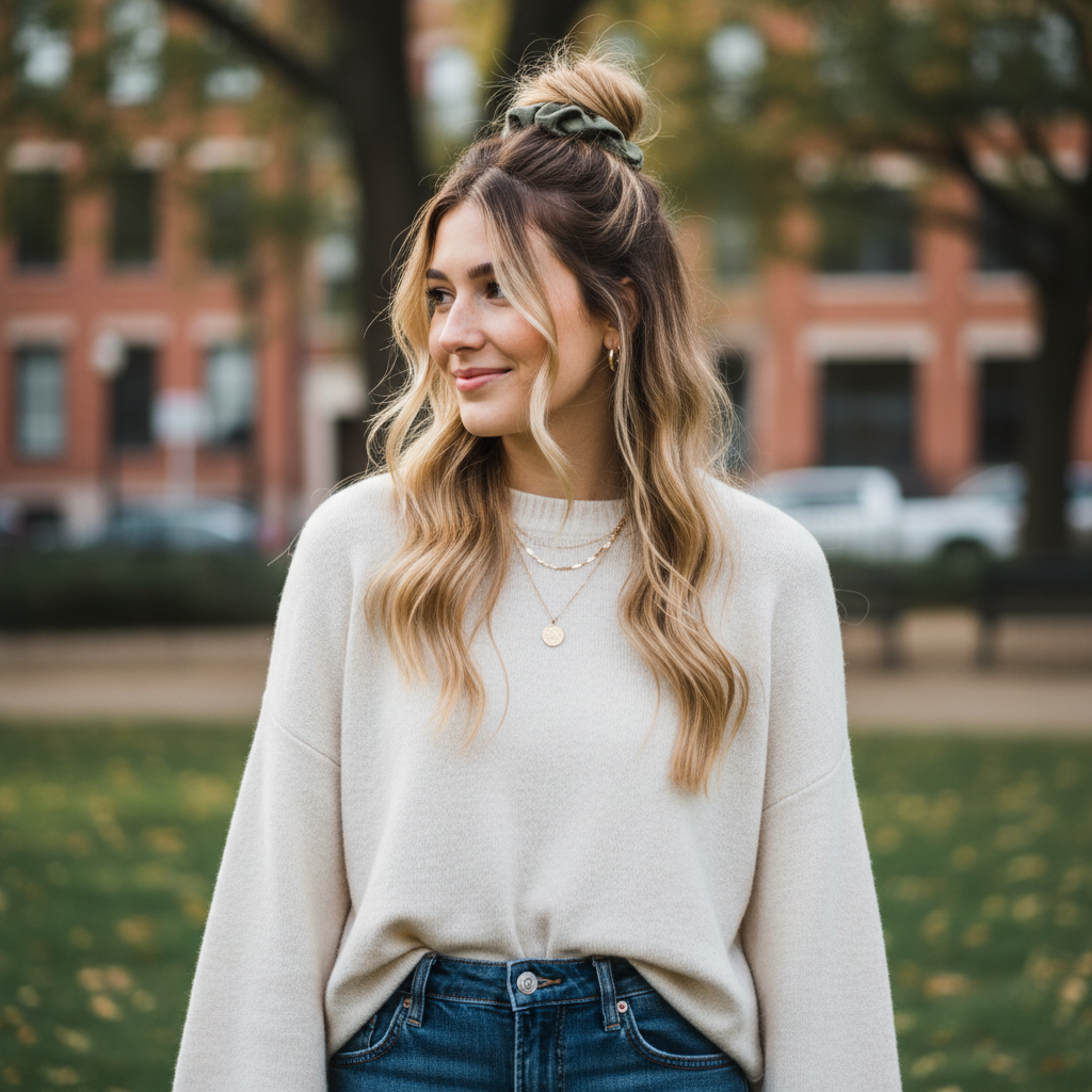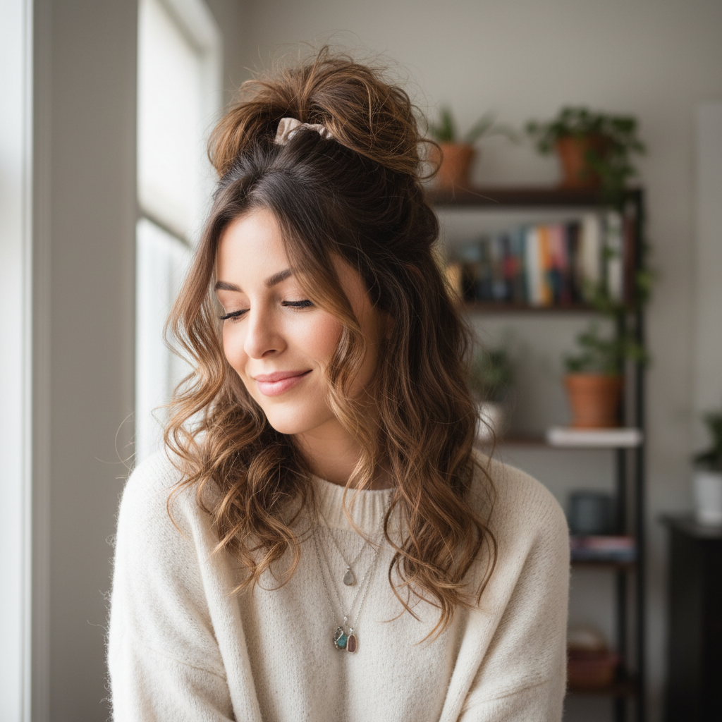 Embrace a trendy, relaxed vibe with the effortless half-up bun. This modern take on the half-up style is perfect for those days when you want to look put-together without appearing overly styled.