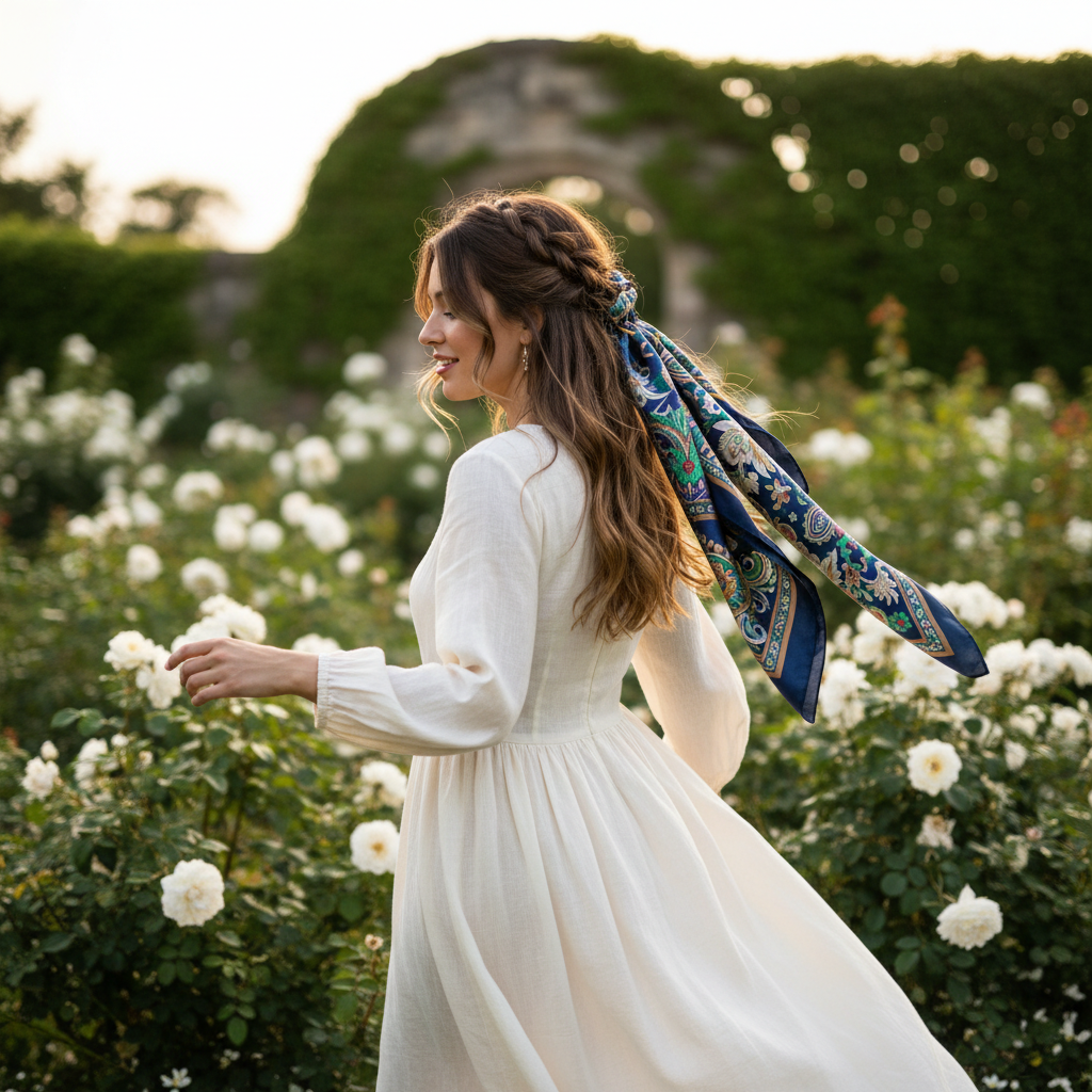 - Styling Method or Technique Secure your half-up ponytail or bun with an elastic, then tie a small silk scarf or ribbon around the base. Alternatively, you can weave the scarf into a simple braid or twist for added flair. Let the ends of the scarf flow with your hair.
