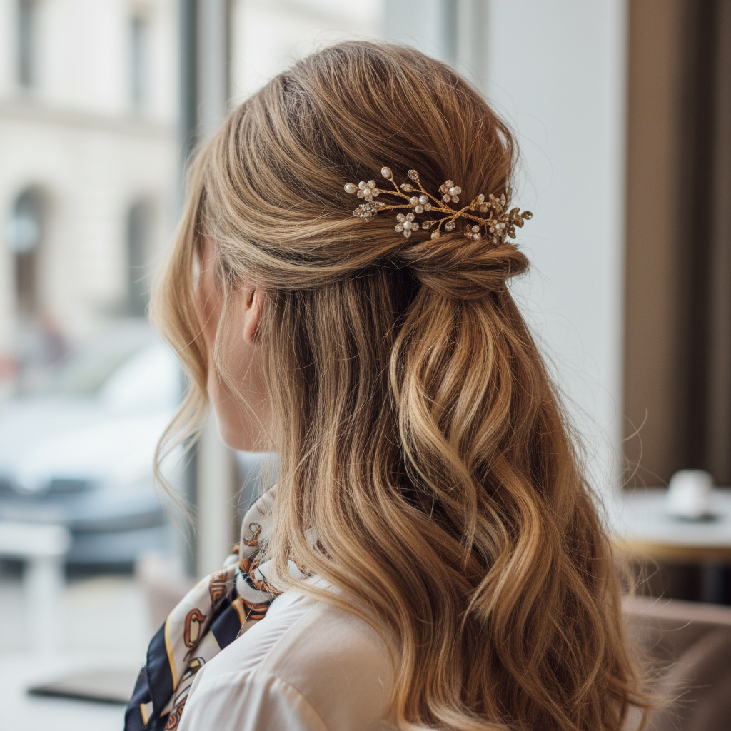 Elevate any half up half down style with the right accessory. From delicate hairpins to bold scrunchies or elegant scarves, accessories can transform your look and add a personal touch, making it unique and eye-catching.