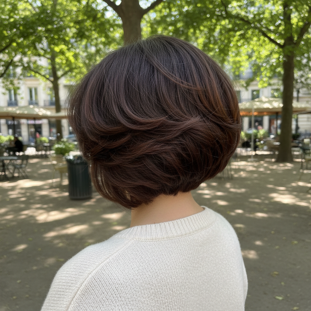 For maximum volume and a sculpted silhouette, the stacked bob is unparalleled. It features graduated layers at the back, creating a rounded, voluminous shape that beautifully complements the nape of the neck, while the front remains longer.
