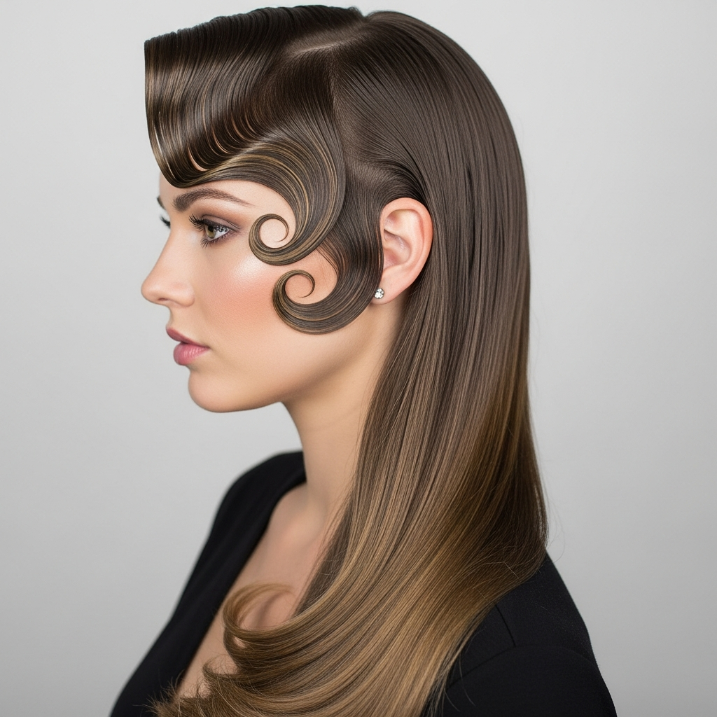 For a truly unique and artistic statement, retro finger waves adapted for long hair offer a stunning 1920s-inspired aesthetic. This style focuses on the front sections of the hair being molded into sharp, glossy ridges while the back remains long and flowing. It is an excellent choice for themed parties or high-concept fashion events.