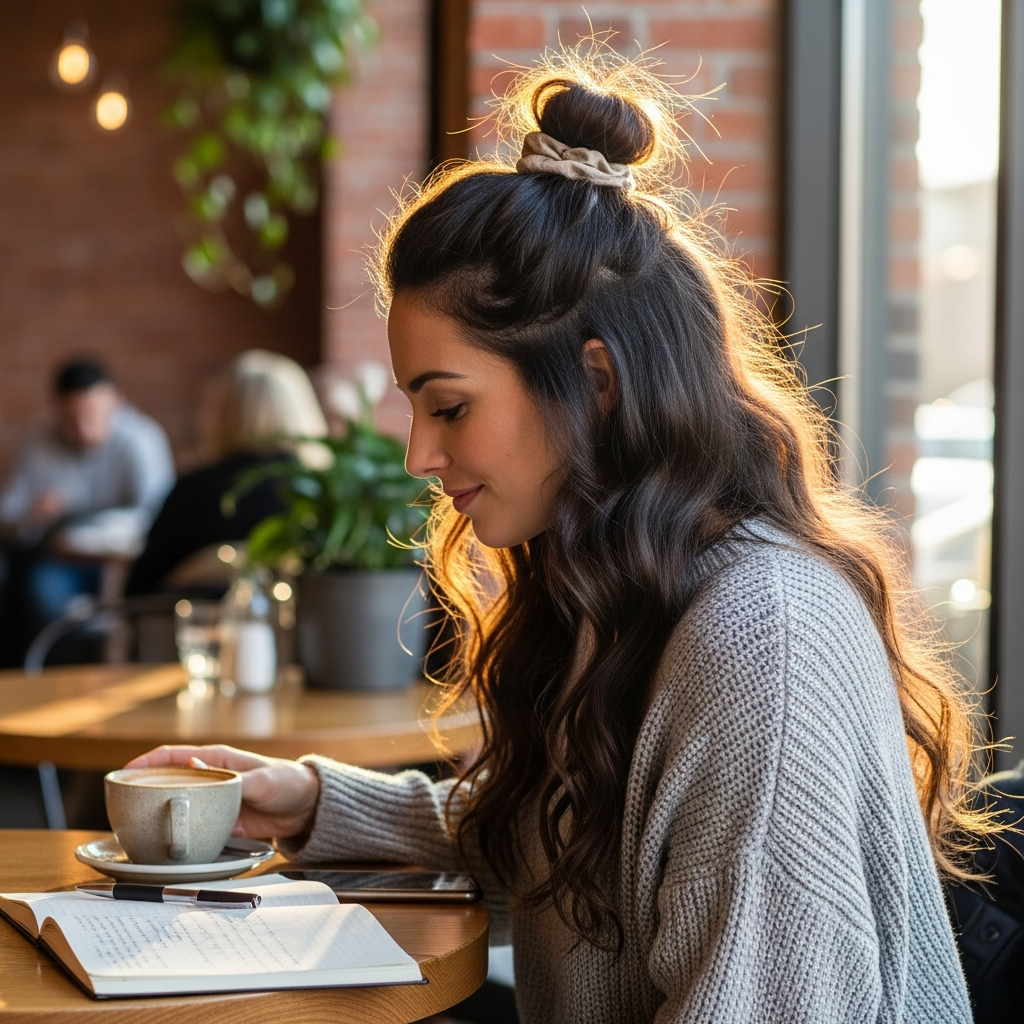 The half-up top knot strikes the perfect balance between casual and chic. By securing the top half of the hair into a small bun while leaving the rest to flow naturally, you keep hair out of your face while maintaining the length. This is an excellent choice for daily tasks, office work, or a relaxed lunch date. It works well with both straight and wavy hair textures.
