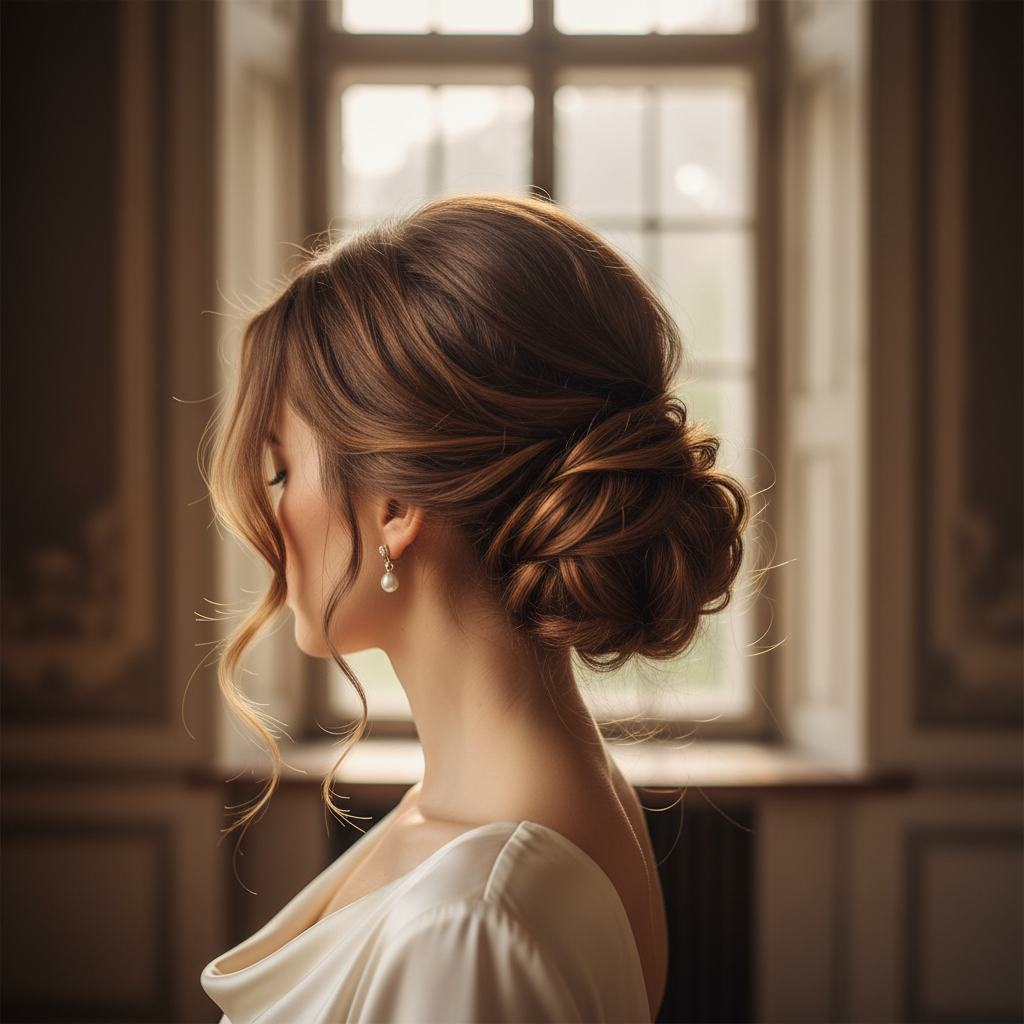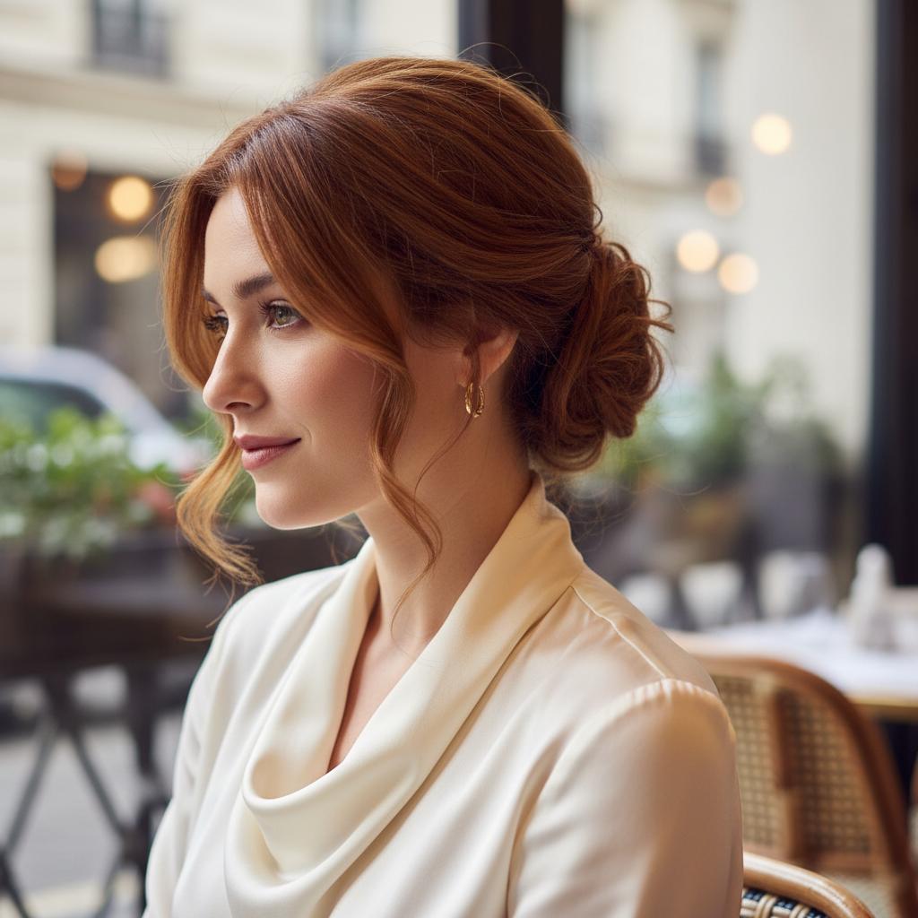 The side-swept messy bun offers a romantic, asymmetrical look that’s perfect for casual elegance. It draws attention to your neckline and can be styled with bangs or face-framing layers.