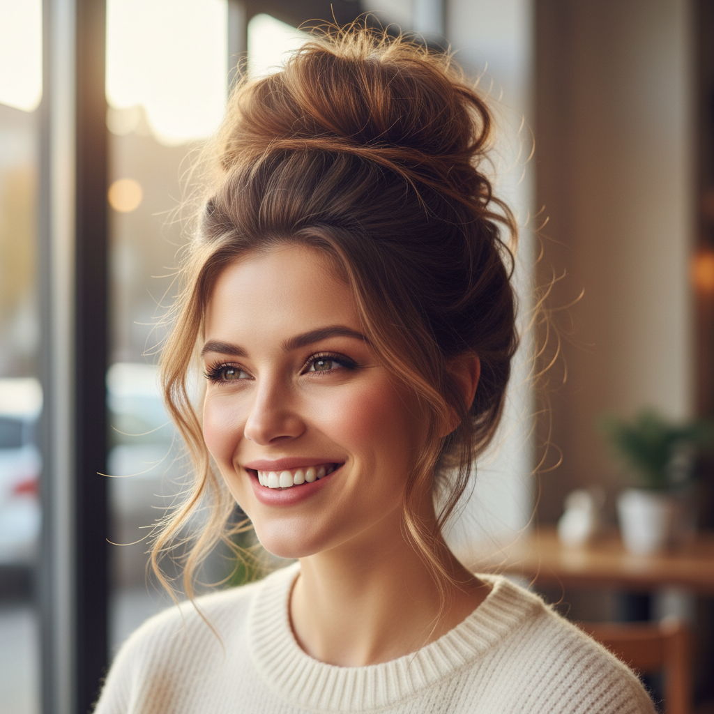 This iconic style sits gracefully at the crown of your head, offering a playful yet sophisticated look. It’s perfect for showcasing your jawline and neck.