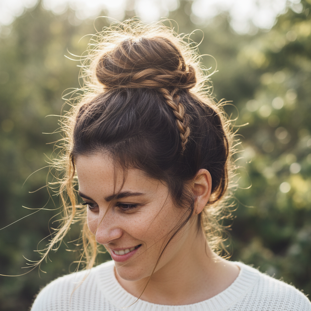 Adding a braid to your messy bun elevates the style, giving it a touch of intricate detail while maintaining its relaxed charm. This works beautifully for a slightly more dressed-up casual look.