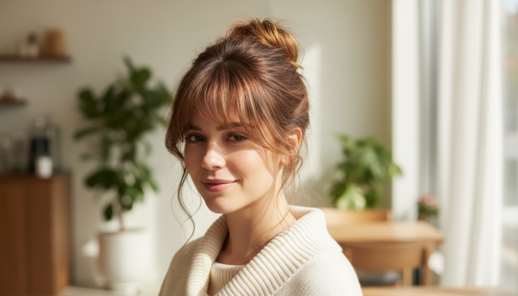 The Messy Bun with Bangs or Face-Framing Layers – Softness and Definition