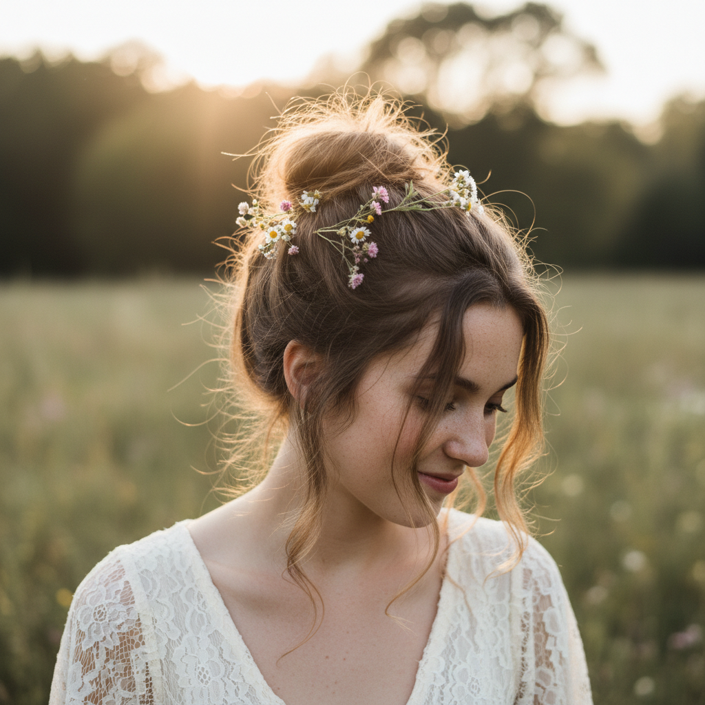 Embrace a free-spirited aesthetic with a loose, voluminous messy bun that often incorporates a few wispy strands or even a subtle braid.