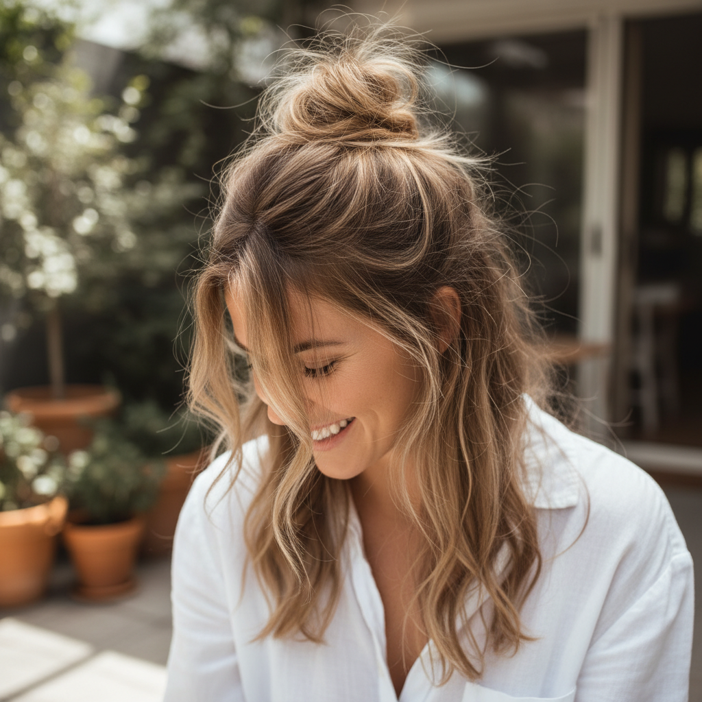 Half-Up Messy Bun – A Playful Touch