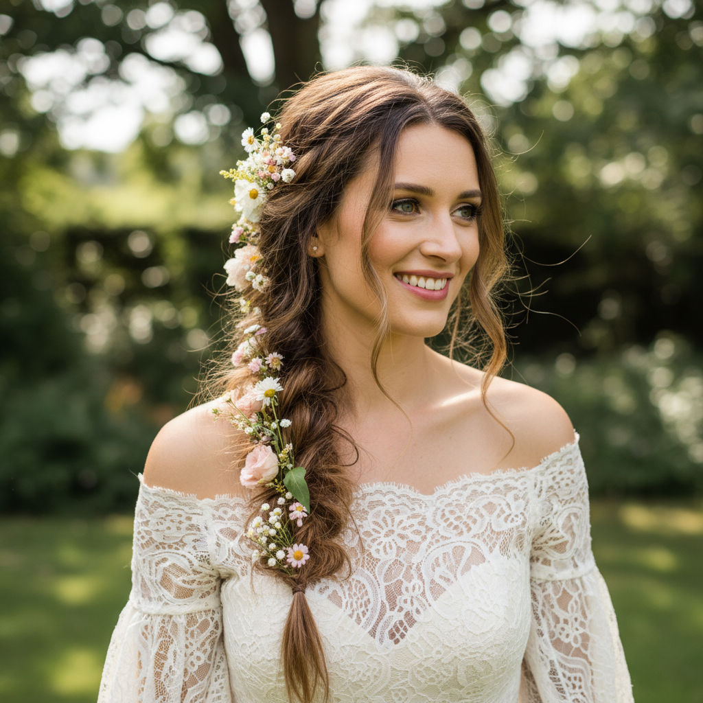This style embraces natural beauty with a whimsical touch. A loose, textured braid adorned with flowers creates a romantic, free-spirited look.