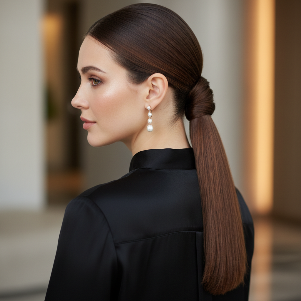 The low ponytail gets a classy upgrade for party season with a stylish twist. This look is modern, minimalist, and incredibly elegant, proving that a ponytail can be far from casual.