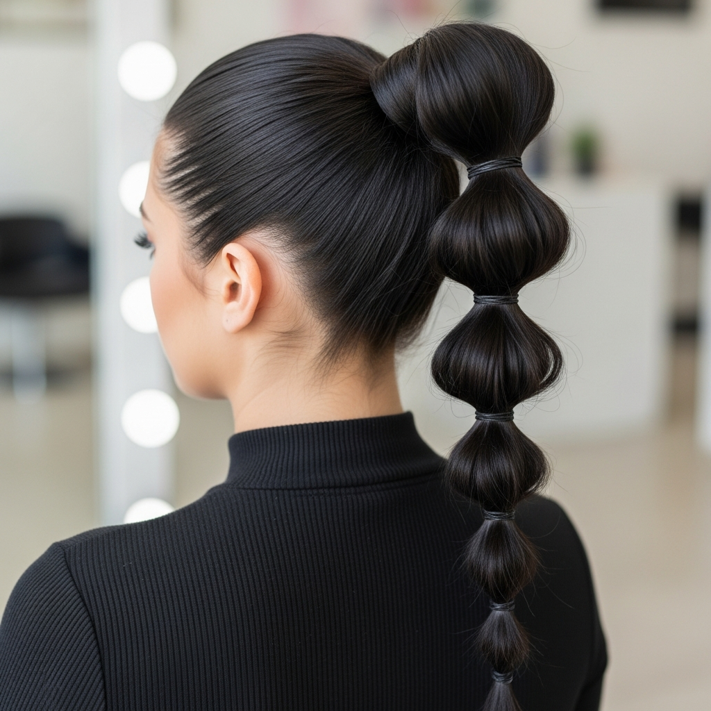The bubble braid ponytail is a fun, whimsical, and super stylish take on the classic ponytail. It adds volume and a playful texture that’s perfect for a casual yet chic look.