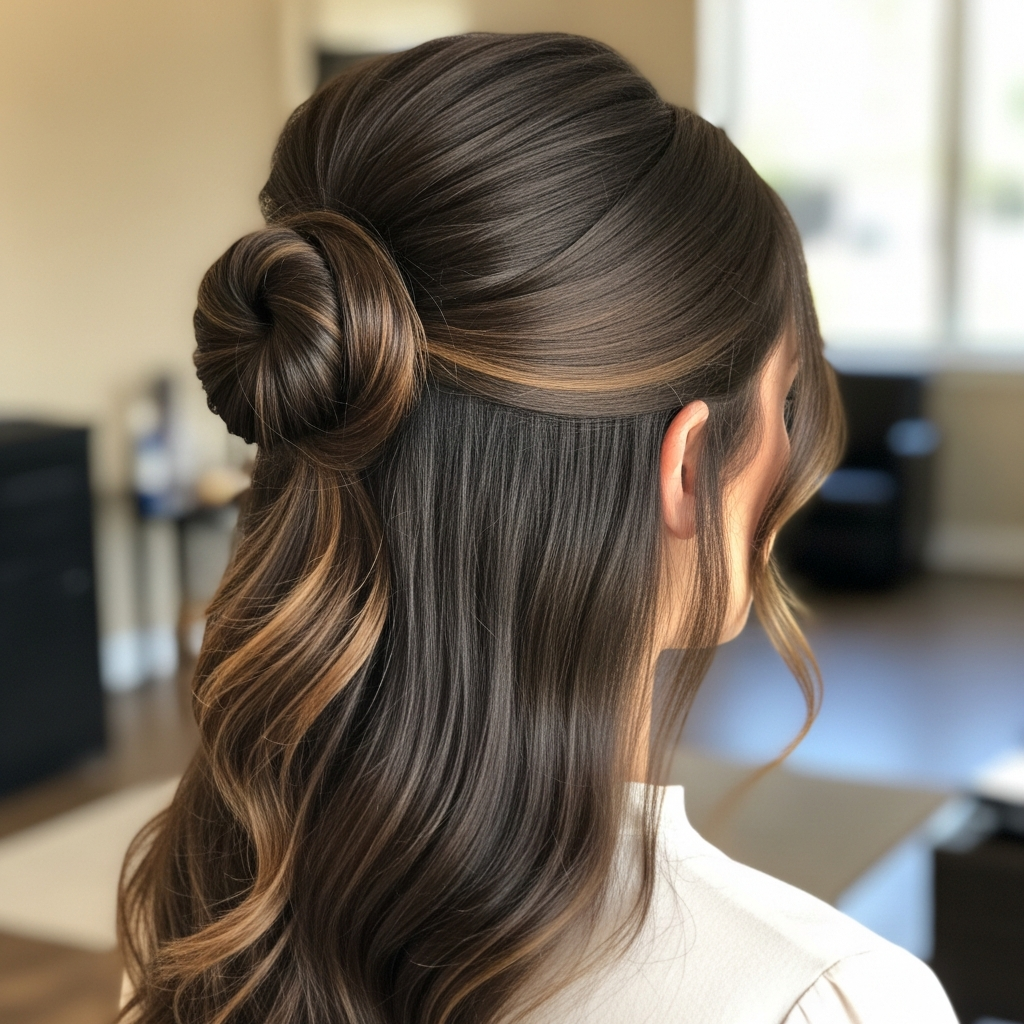 The half-up top knot is a trendy and playful style that perfectly balances casual coolness with keeping hair out of your face. It’s an instant style enhancer.