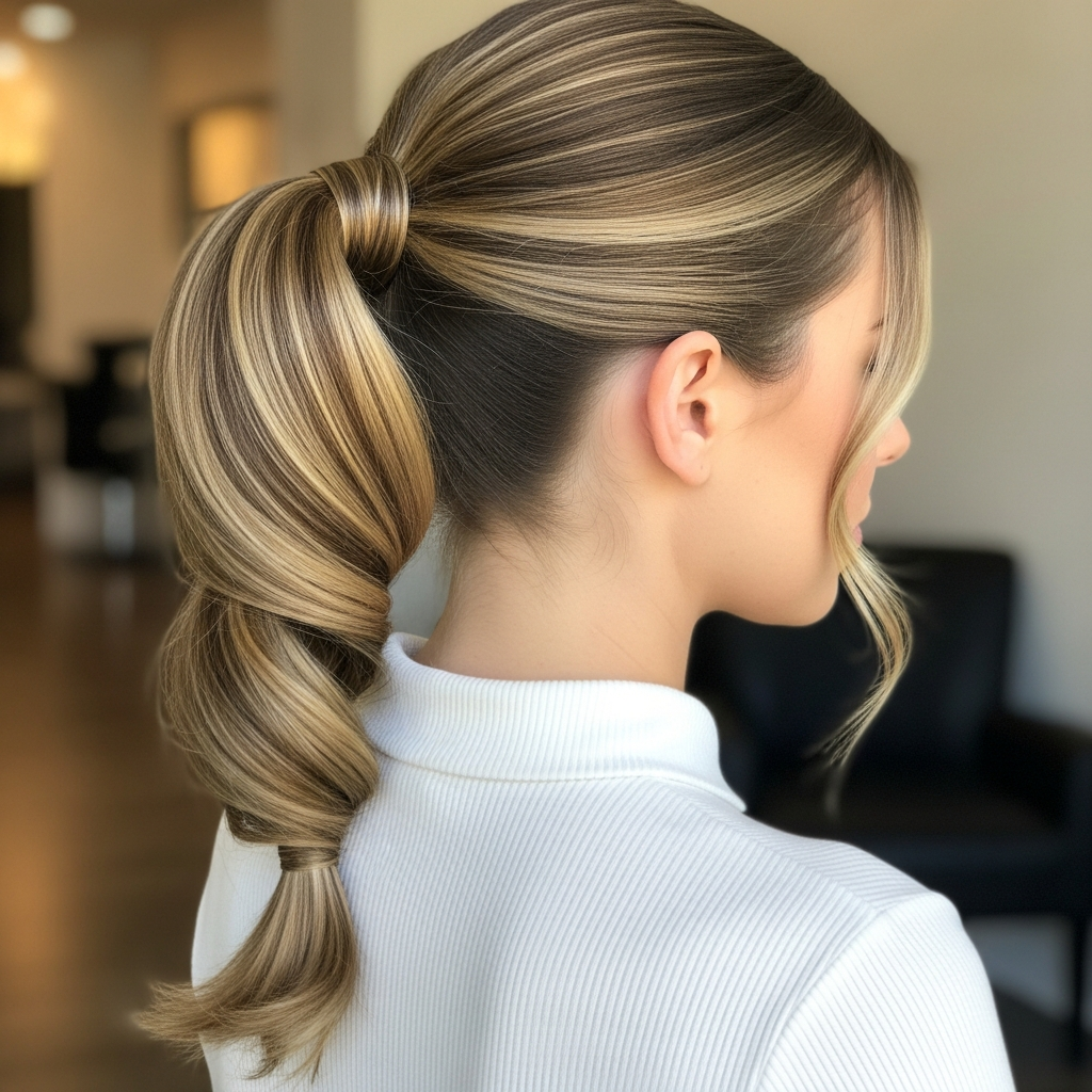 This style transforms a simple ponytail into something much more refined with minimal effort. It’s perfect for busy mornings when you want a polished look in seconds.