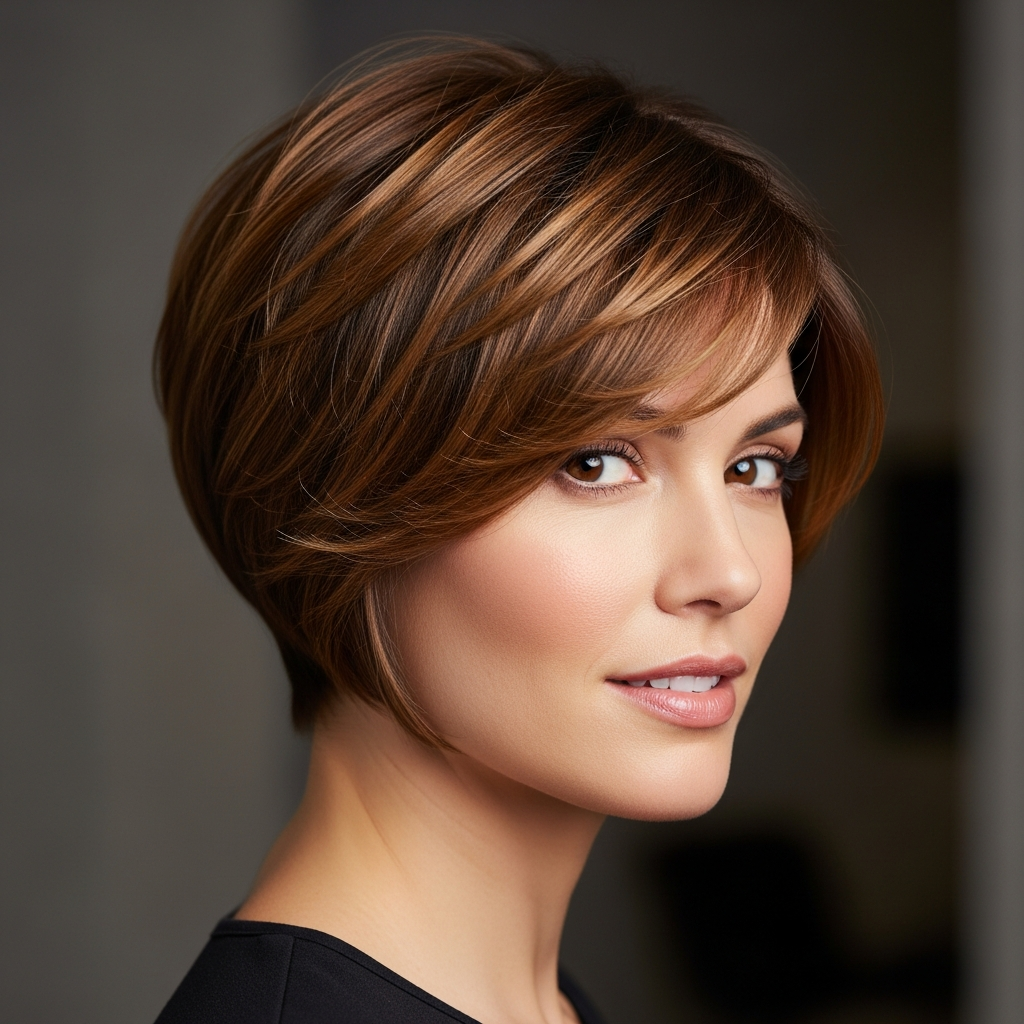 Adding side-swept bangs can instantly update any short haircut, whether it is a pixie, bob, or crop. This style works for all hair types, from straight to curly, as long as the bangs are long enough to sweep across the forehead. The overall hair length can be very short or chin-length.