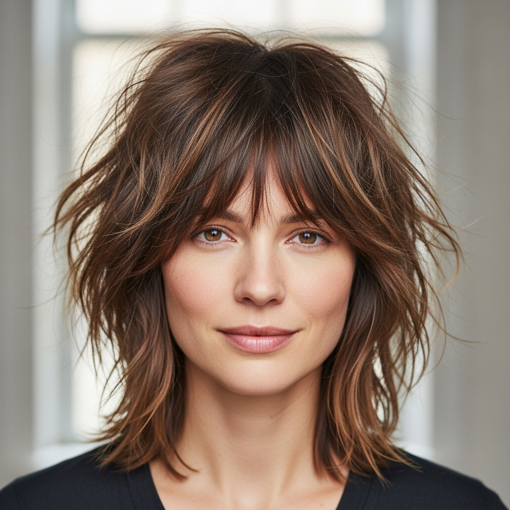 The shaggy bob is all about layers, texture, and a cool, undone vibe. It features choppy layers throughout, often with a fringe, and works well on medium to thick hair that is straight, wavy, or even slightly curly. Length can vary from chin to shoulder.