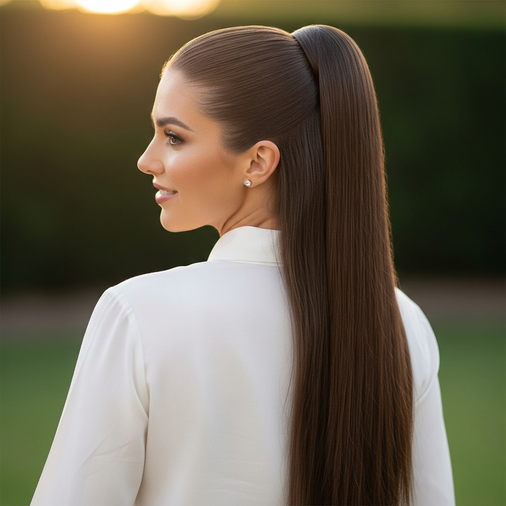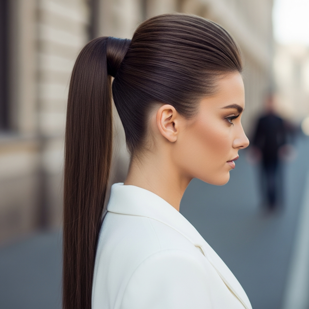 This is perhaps the most iconic sleek ponytail. It sits proudly at the crown of your head, pulling all your hair back for a lifted, elongating effect. It’s chic, powerful, and instantly adds a touch of glam to any outfit. Think supermodel off-duty vibes or a red carpet staple.