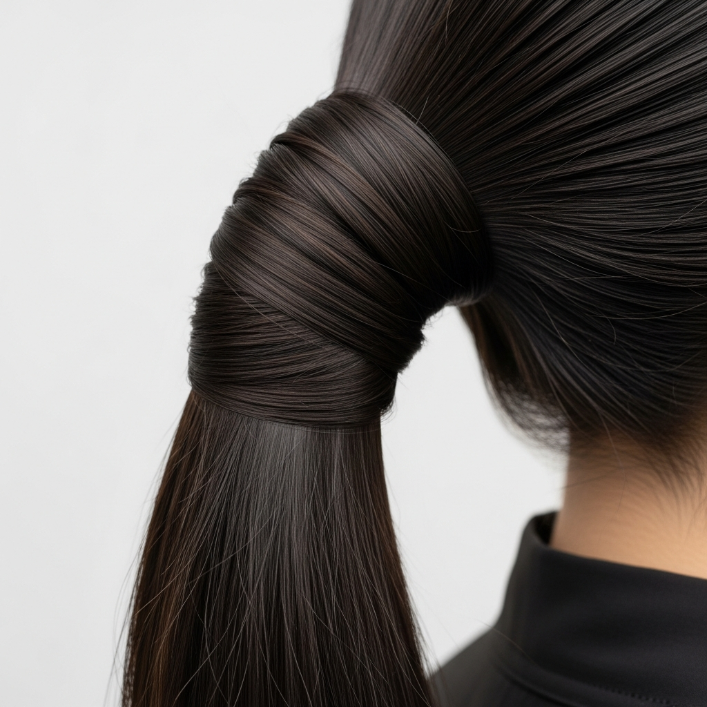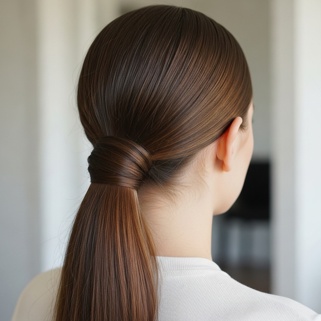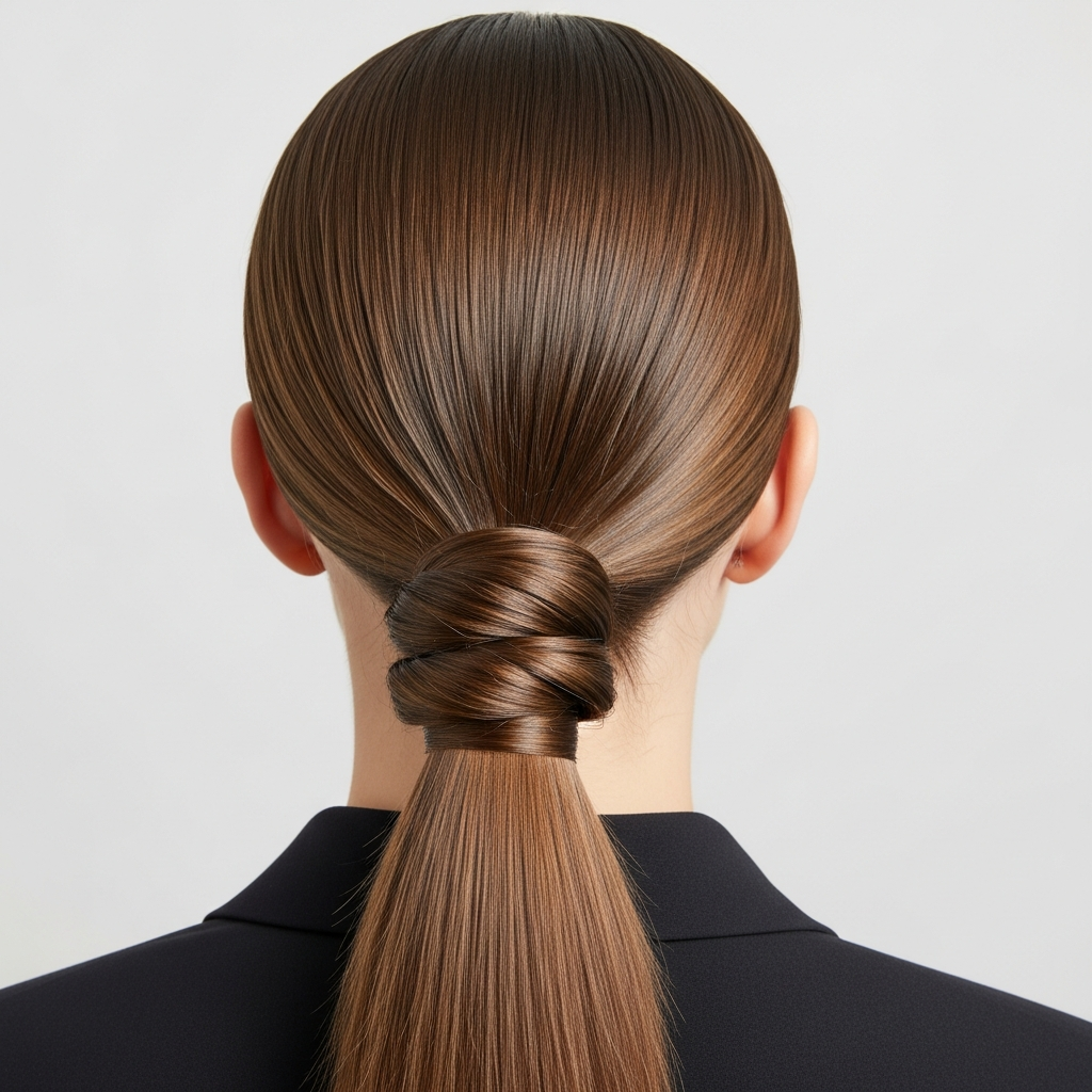 Styling Method: Create your desired sleek ponytail (high, mid, or low). Take a small to medium section of hair from the underside of the ponytail. Wrap this section tightly and smoothly around the elastic, covering it completely. Secure the end of the wrapped section with a small bobby pin tucked underneath the ponytail. Smooth any stray hairs with gel.