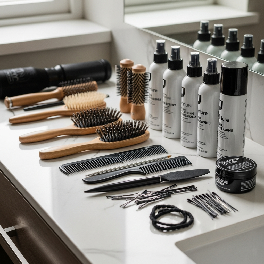 Recommended Tools and Products: Tail comb for precise parting, soft bristle brush, elastic hair tie, bobby pins, smoothing serum, light-hold hairspray.