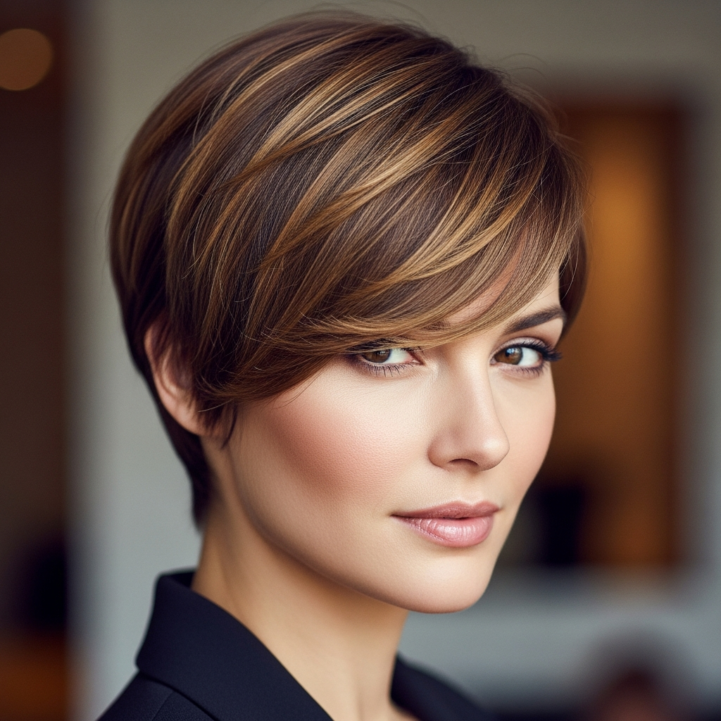 A side-swept pixie adds a layer of elegance to the standard short cut. By keeping the fringe long and sweeping it across the forehead, this style softens the overall look and adds a touch of mystery. It is a great transitional cut for those moving from longer styles to shorter ones.