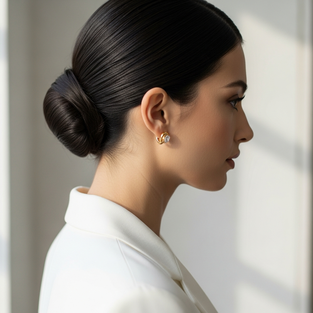 When a formal event calls for elegance, the polished low bun is the perfect solution. Parted in the middle and secured at the nape of the neck, this style is heat-resistant and maintains its structure even in high humidity. It is the ultimate choice for summer weddings and corporate garden parties.