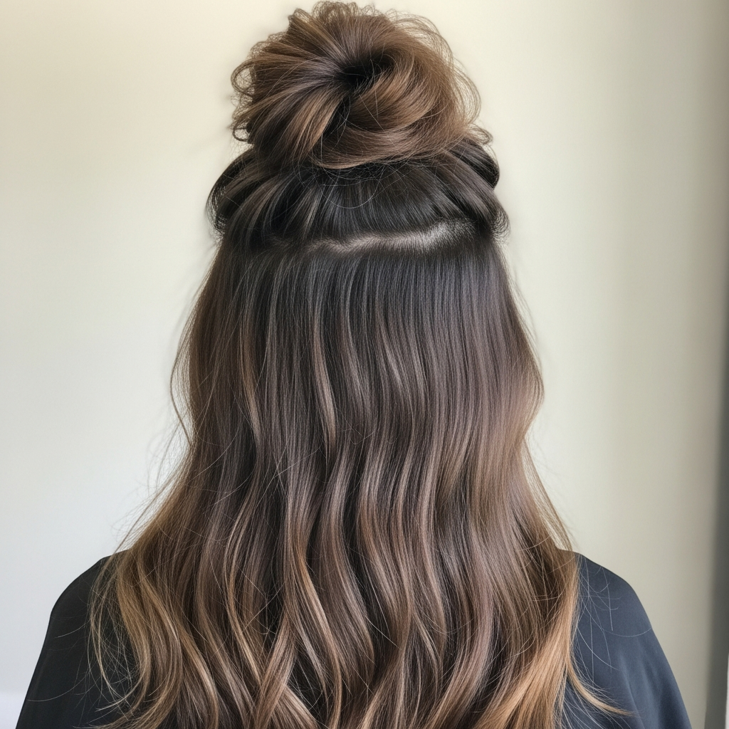 The half-up top knot offers the best of both worlds: you get to show off your length while keeping hair out of your eyes. It is a versatile choice that transitions easily from a morning workout to a casual lunch. It works equally well on short, medium, and long hair lengths.
