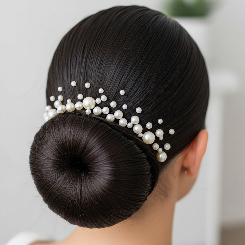 The classic chignon is elevated for the modern bride through the strategic use of hair accessories. By adding scattered pearls or a minimalist metallic pin, a simple bun is transformed into a contemporary masterpiece. This look is particularly effective for brides wearing minimalist gowns, as the subtle detailing in the hair adds a touch of luxury without overwhelming the overall ensemble. It is the epitome of refined bridal style.