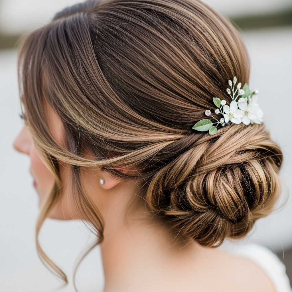 The low bun remains a bridal staple because of its versatility, but the modern version focuses heavily on texture. Rather than a tight, smooth knot, this look incorporates twists, braids, or loose strands to create a sense of effortless elegance. It is an ideal choice for brides who want an updo that feels romantic and slightly undone. This style also provides a secure foundation for attaching a veil at the nape of the neck.