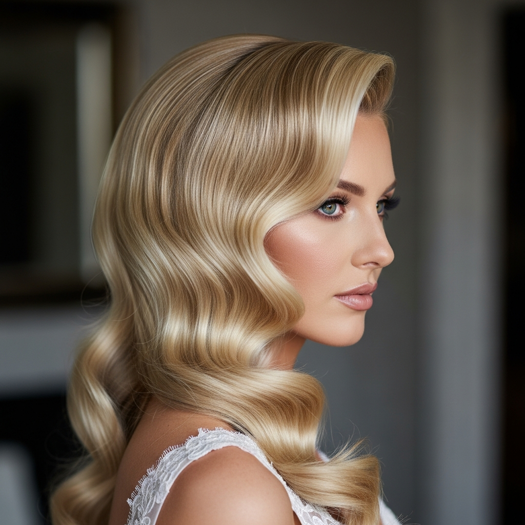 Hollywood waves have been reimagined for the modern era by making them softer and less structured. Instead of the stiff, uniform waves of the past, contemporary brides prefer a more touchable finish. This style features a deep side part and voluminous, glossy waves that frame the face beautifully. It is the perfect balance of vintage glamour and modern ease, working exceptionally well with strapless or sweetheart necklines.
